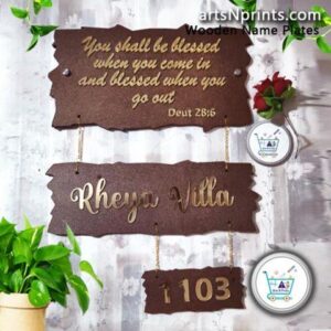 “Designer Multilayer Rheya Villa Hanging Wooden Nameplate Designs with golden acrylic Letters | Delivery at Kerala.artsnprints.com”